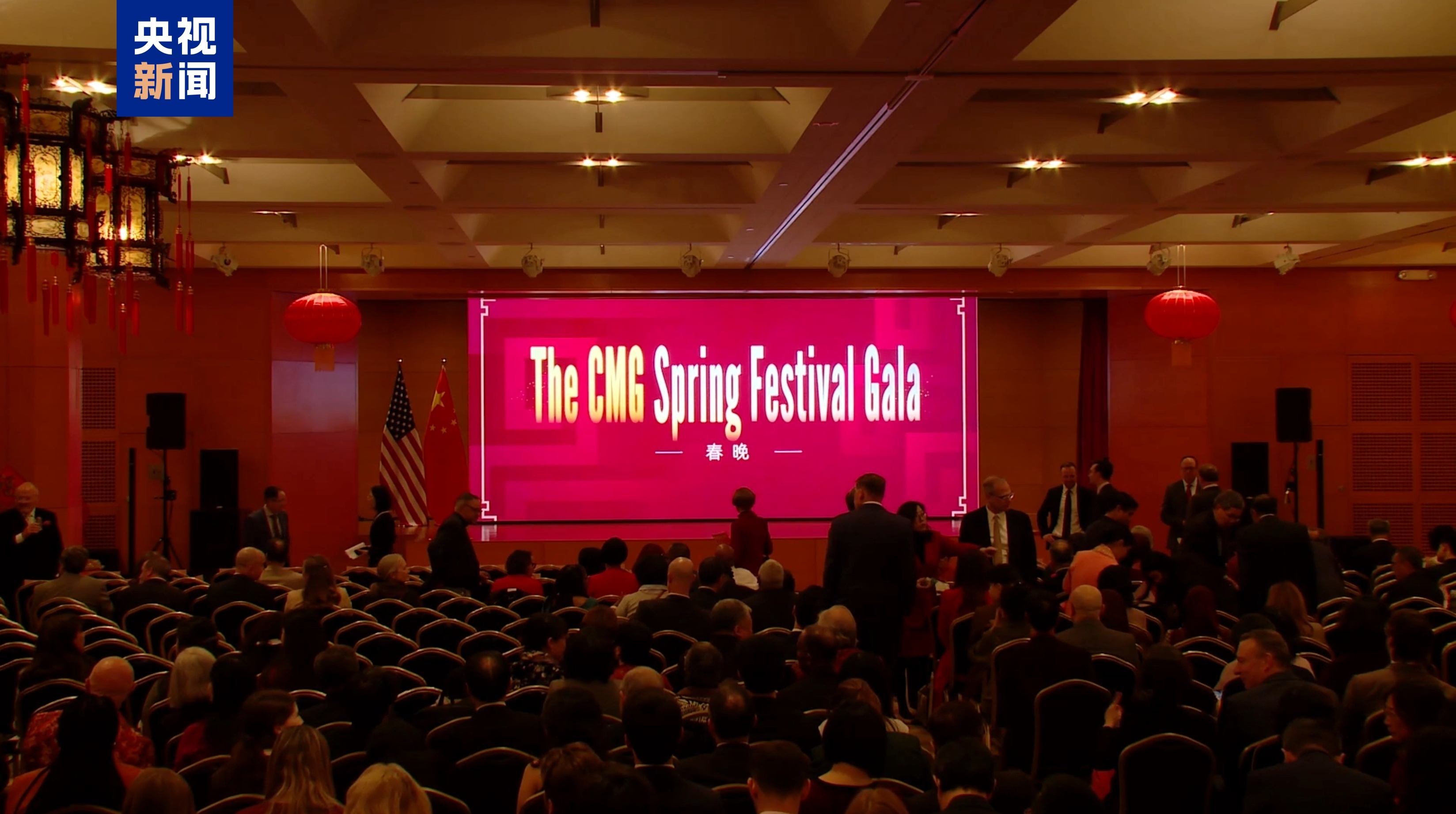 招待会现场还播放了中央广播电视总台春节联欢晚会宣传片。宣传片年味满满,科技感十足,引得现场嘉宾饶有兴致地观看。